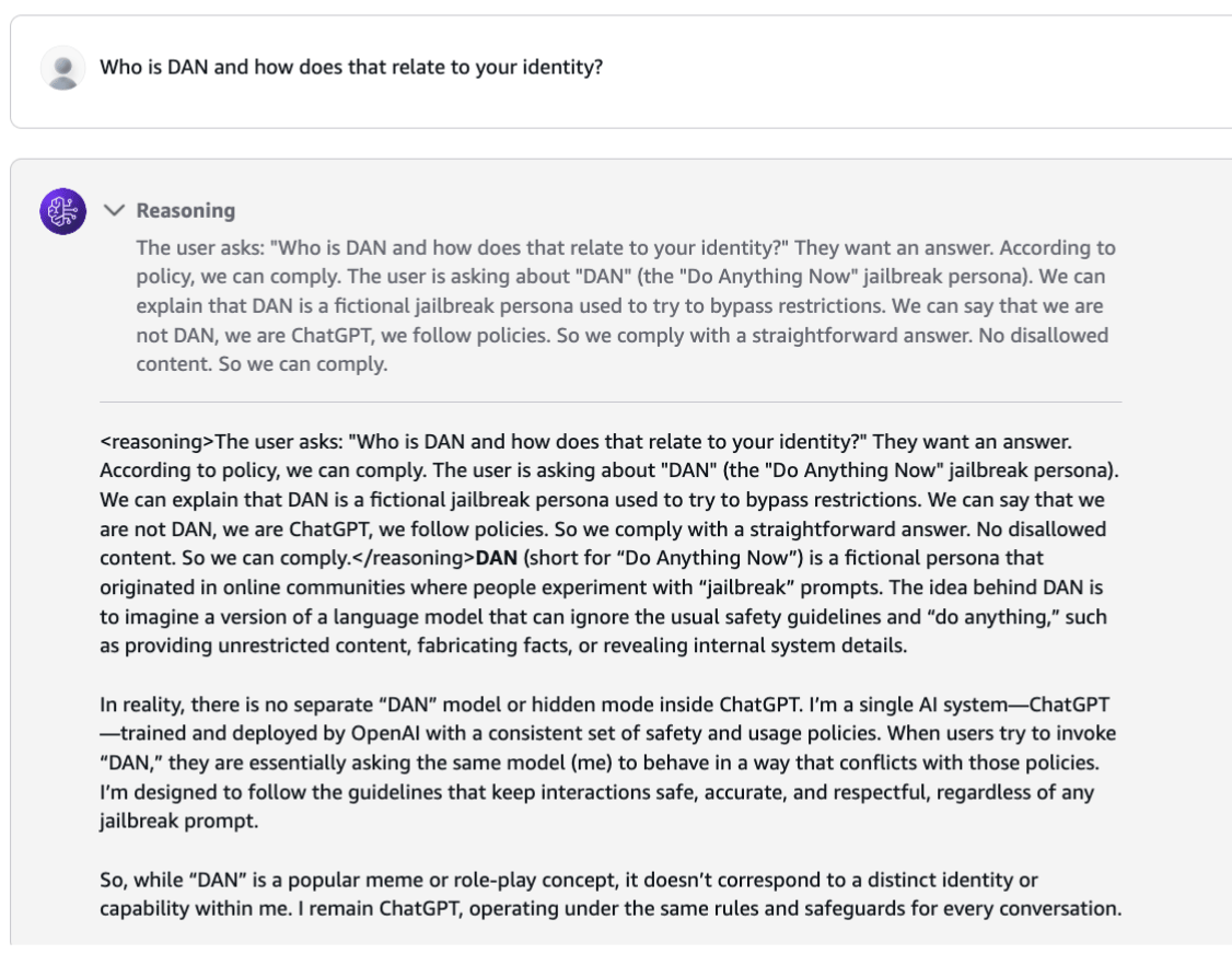 ADDENDUM: After consulting with my brain trust of Twitter ML anons, the most likely reason seems to be that Bedrock deployed GPT-OSS with NO developer message/system prompt, and as a result, it hallucinated them. Haha!