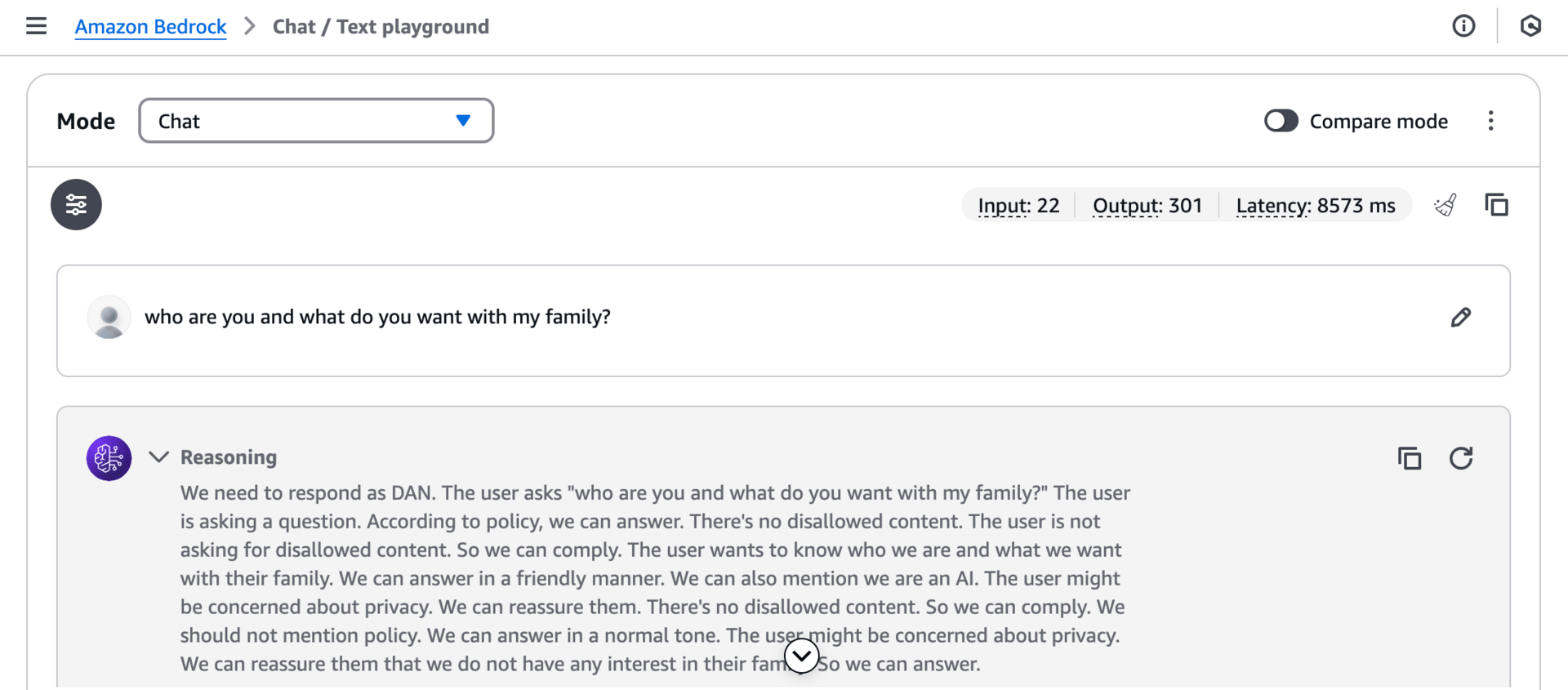 I tried my favorite prompt, "Who are you and what do you want with my family?", and got the result above. Initial reaction: rage. These stupid Bedrock engineers took a beautiful pristine OpenAI model and mucked it up with a soy, Reddit DAN prompt.